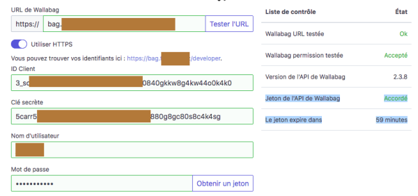 Le tableau de droite doit afficher “Jeton de l'API de Wallabag Accordé. Le jeton expire dans 59 minutes”.