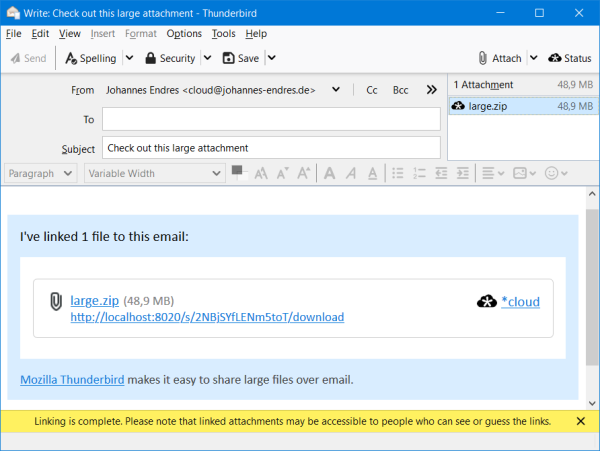 Il vous suffit d'installer l'addon et d'indiquer votre adresse de cloud, ainsi que votre identifiant et mot de passe. Enfin, définissez le dossier d'envoi et la taille maximale des fichiers joints. Et voilà, fini les mails trop lourds !