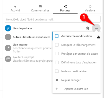 Nextcloud permet de partager des documents et/ou dossiers à l'extérieur, par un simple lien URL. Ce lien peut être protégé par mot de passe, ouvert ou non à la modification, et une date d'expiration du lien peut être réglée.